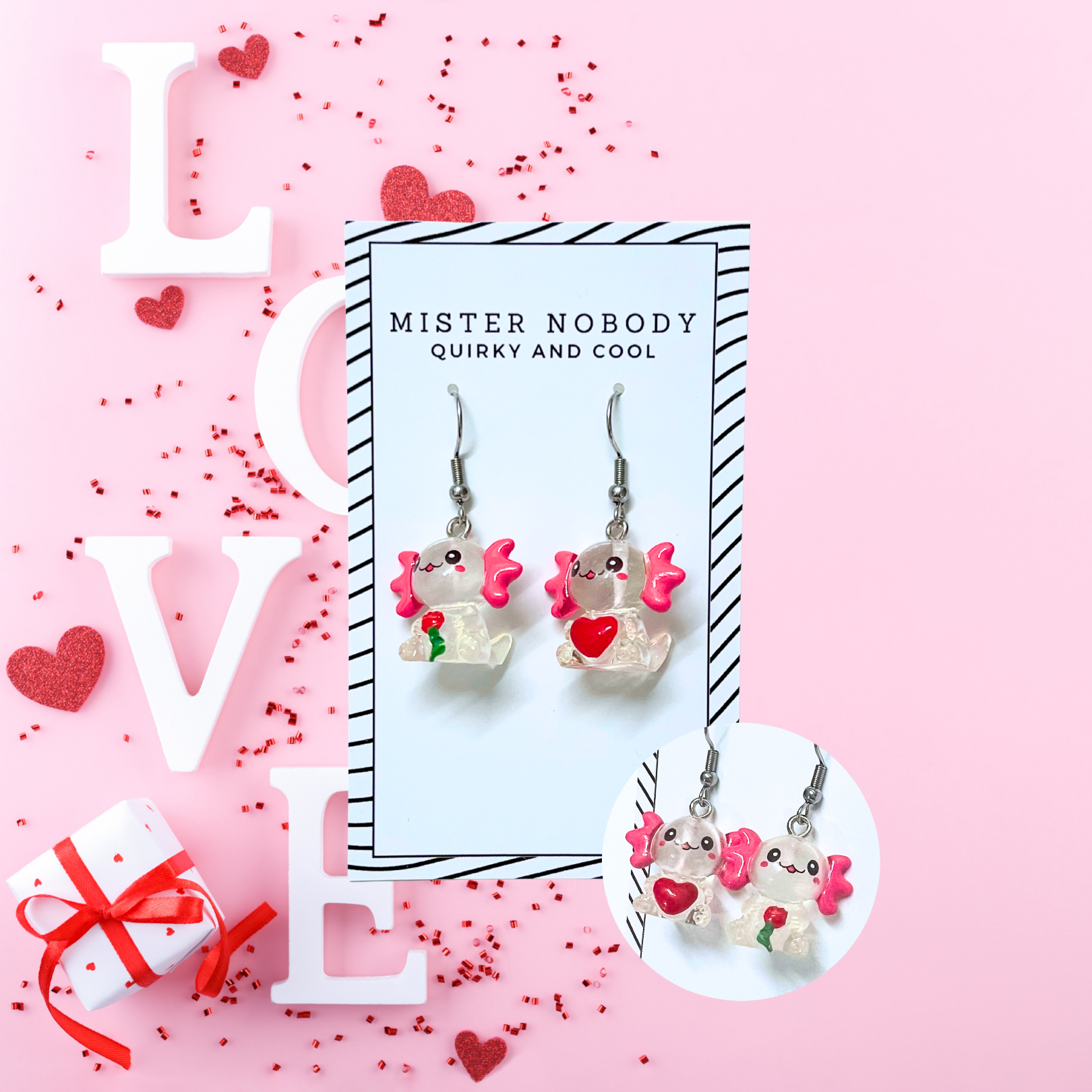 Love Axolotl Dangles are here to flirt with your outfit. Handmade with love, packed with personality and impossible not to smile at. Lightweight, comfy and perfect for Valentine’s Day or Galentine’s. Hypoallergenic stainless steel hooks and soft plastic stoppers because cute should never hurt.